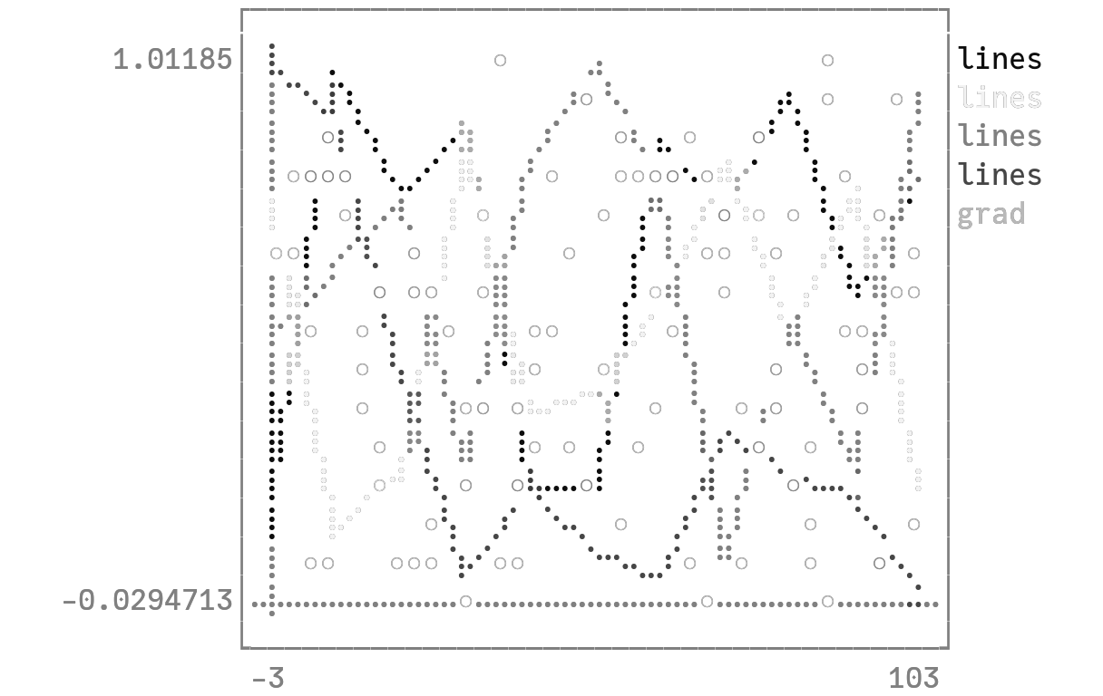 unicodeplots()Access predefined palettes (or build your own with the colorscheme method). Line/marker colors are auto-generated from the plot's palette, unless overridden. Set the z argument to turn on series gradients.