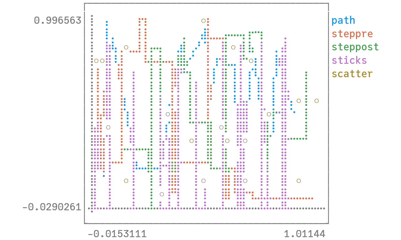 unicodeplots()linetypes = [:path :steppre :steppost :sticks :scatter]