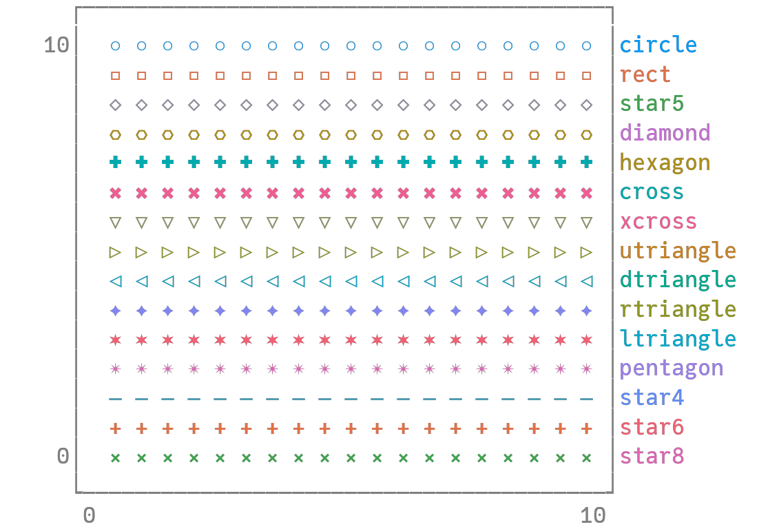 scatter(x, y, m = markers, markersize = 8, lab = map(string, markers), bg = :linen, xlim = (0, 10), ylim = (0, 10))