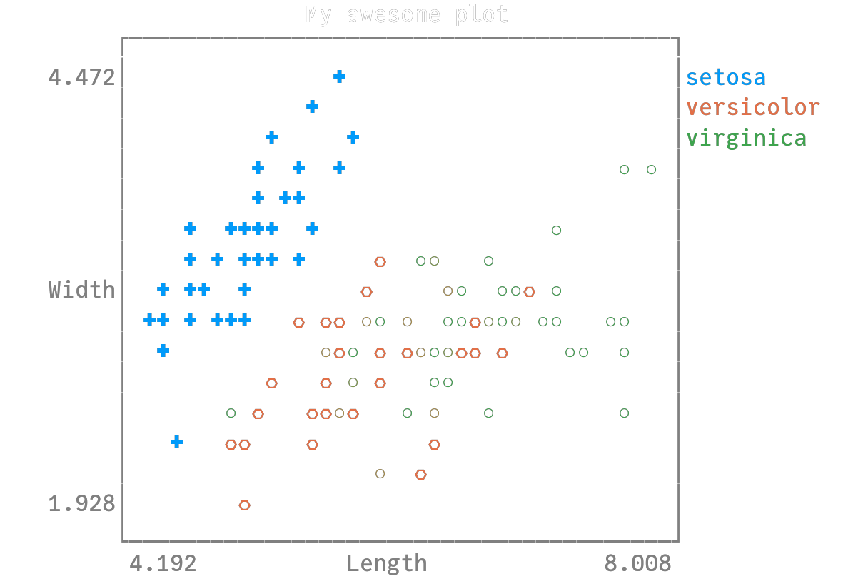 @df iris scatter(:SepalLength, :SepalWidth, group = :Species, title = "My awesome plot", xlabel = "Length", ylabel = "Width", marker = (0.5, [:cross :hex :star7], 12), bg = RGB(0.2, 0.2, 0.2))