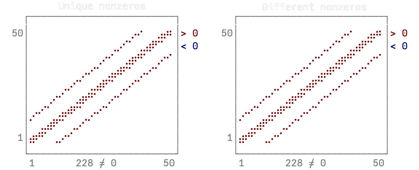 plot(spy(a), spy(b), title = ["Unique nonzeros" "Different nonzeros"])