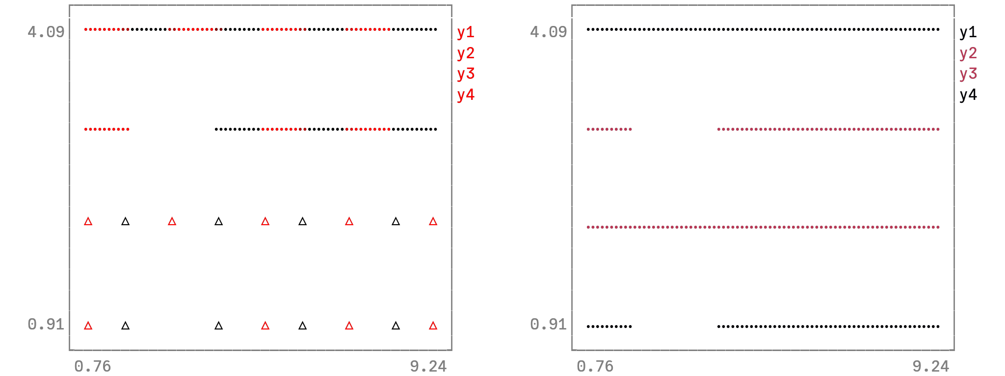 plt_color_rows = plot(y, seriestype = [:path :path :scatter :scatter], markershape = collect(take(cycle((:utriangle, :rect)), 9)), markersize = 8, color = collect(take(cycle((:red, :black)), 9)))